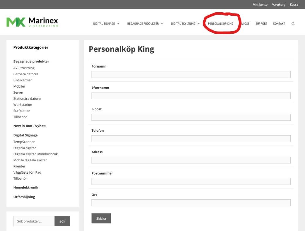 • Once you have registered, you can start shopping. You will also receive an e-mail with your login details if you want to shop several times. You should see the category named ”Personalköp-King” which is located on the menu at the top of the page. Here you will find the units that pertain to the personal purchase (see red-marked ring in picture 1).